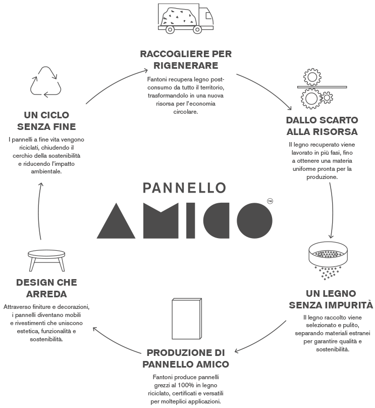 Fantoni recupera legno post- consumo da tutto il territorio, trasformandolo in una nuova risorsa per l’economia circolare.