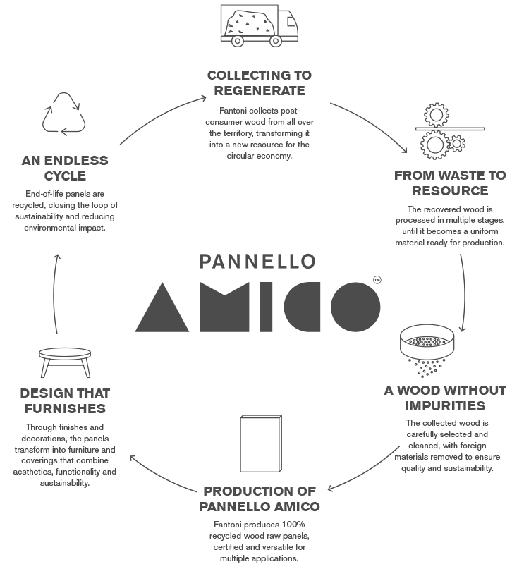 Fantoni collects post- consumer wood from all over the territory, transforming it into a new resource for the circular economy.
